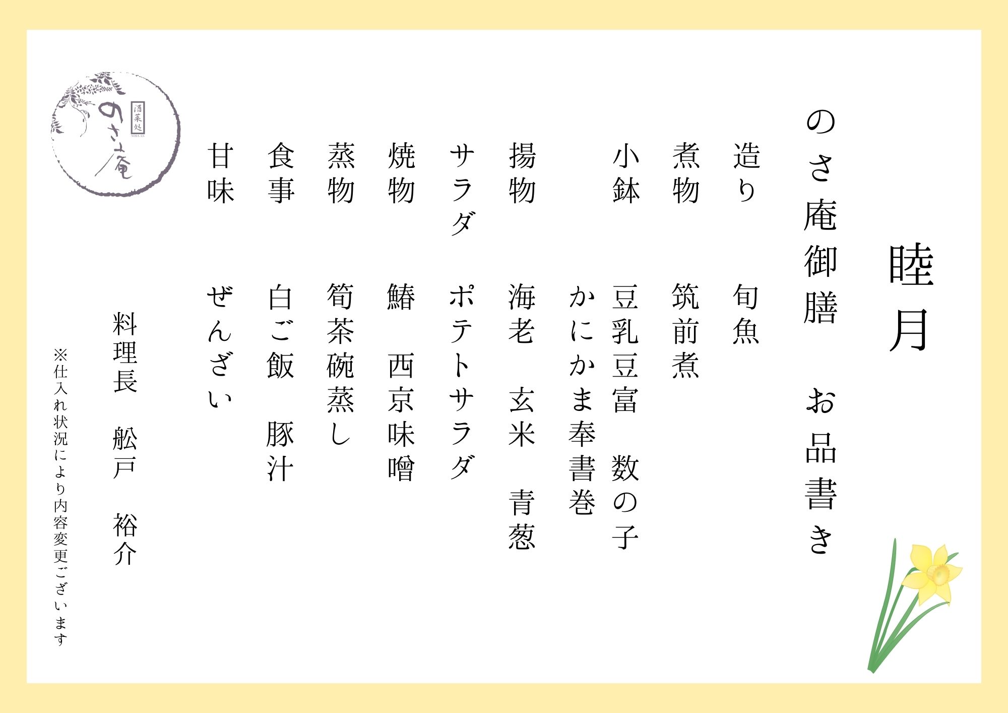 令和8年1月のさ庵御膳(ランチ)お品書き